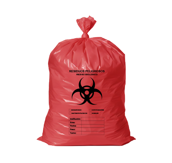 Bolsas para basura de color rojo con características de resistencia al rasgado y al peso; manufacturadas en máquinas de alta tecnología, cuenta con uncalibre 1.4 y 1.6 y con un sellado anti derrame en forma de cruz.