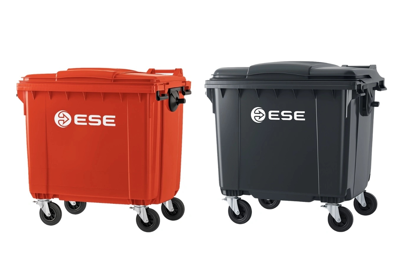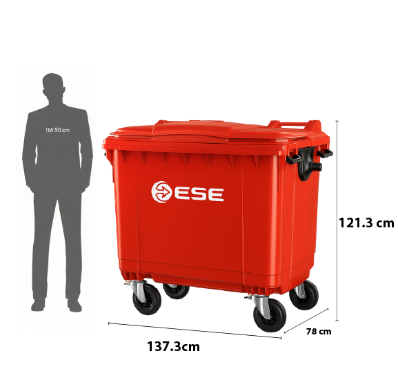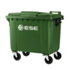 Contenedor de 1100 litros con diseño robusto y ruedas duraderas, ideal para facilitar el manejo de grandes volúmenes de residuos en instalaciones comerciales e industriales.