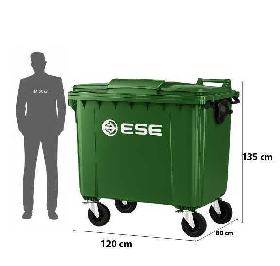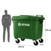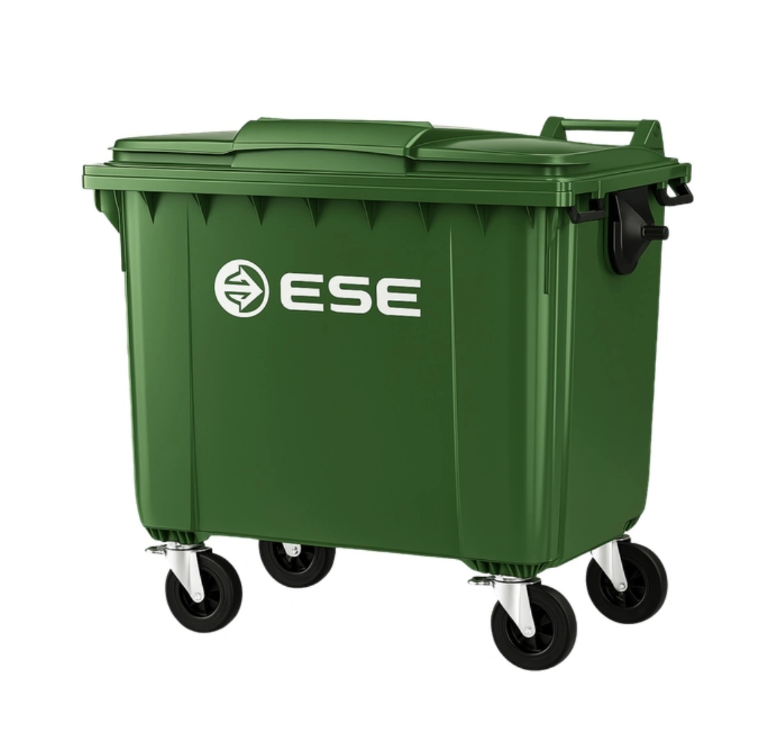Contenedor de 770 litros con diseño robusto y ruedas duraderas, ideal para facilitar el manejo de grandes volúmenes de residuos en instalaciones comerciales e industriales.