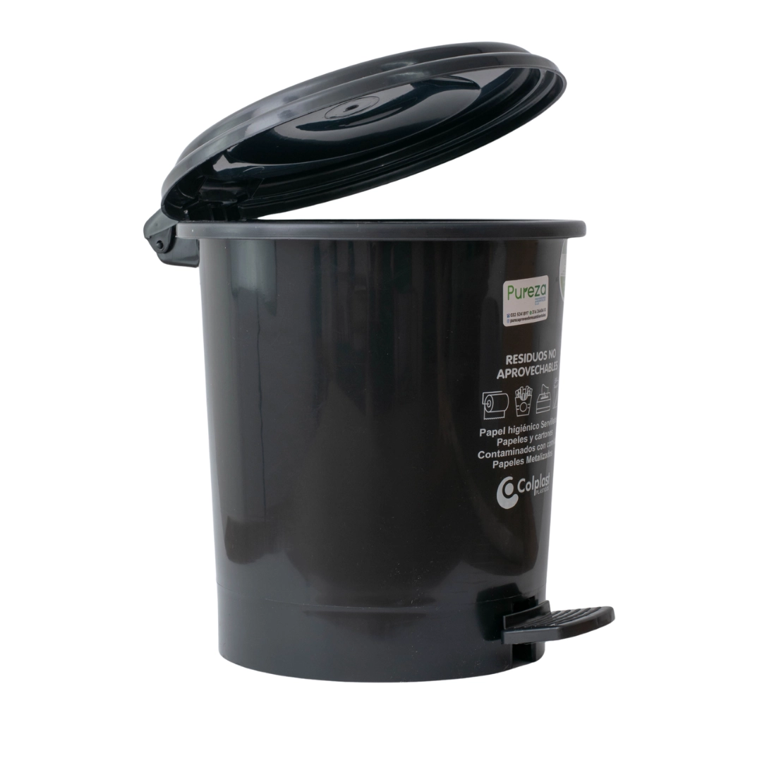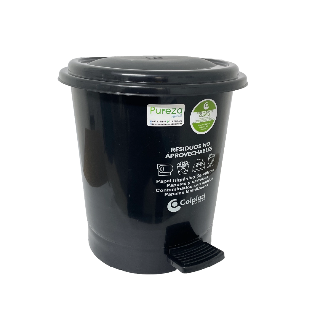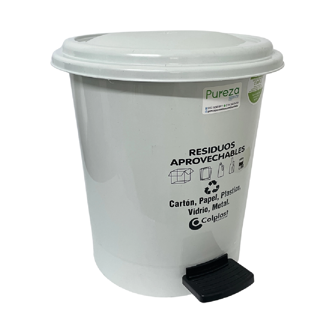 Papelera redonda de 12 litros. Sistema de apertura con pedal para evitar el contacto con las manos, tapa plana. Disponible en varios colores según tipo de residuo.
