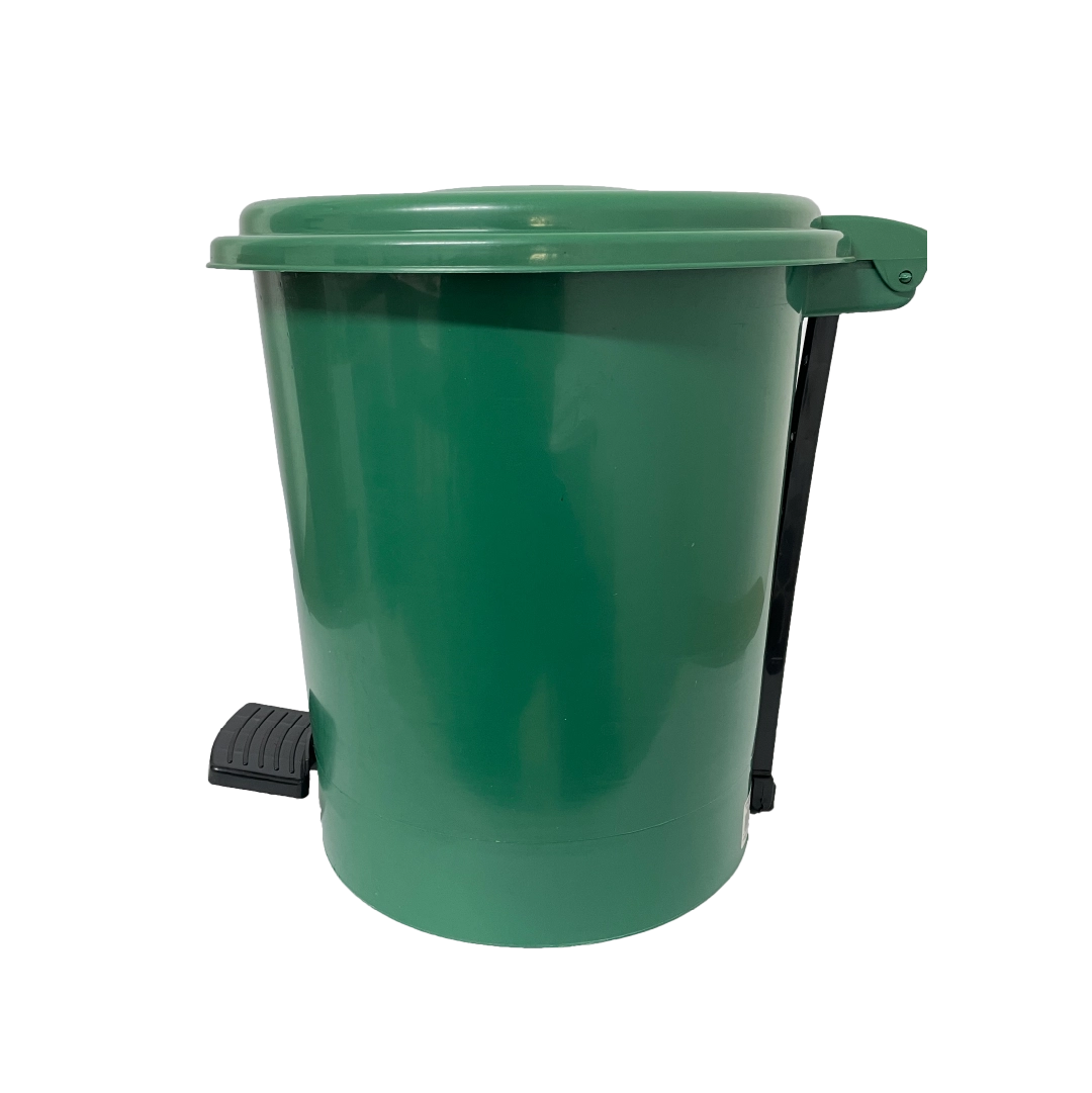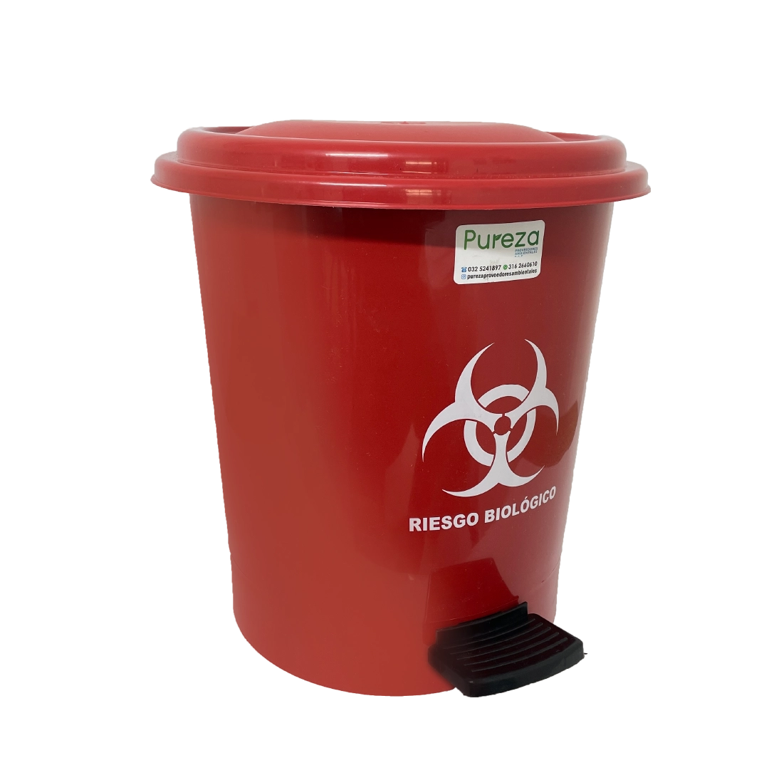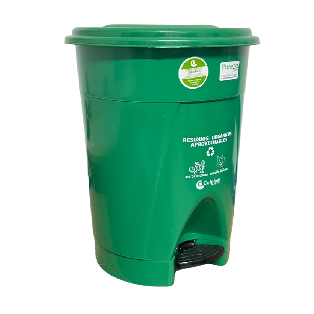 Papelera redonda de 12 litros. Sistema de apertura con pedal para evitar el contacto con las manos, tapa plana. Disponible en varios colores según tipo de residuo.
