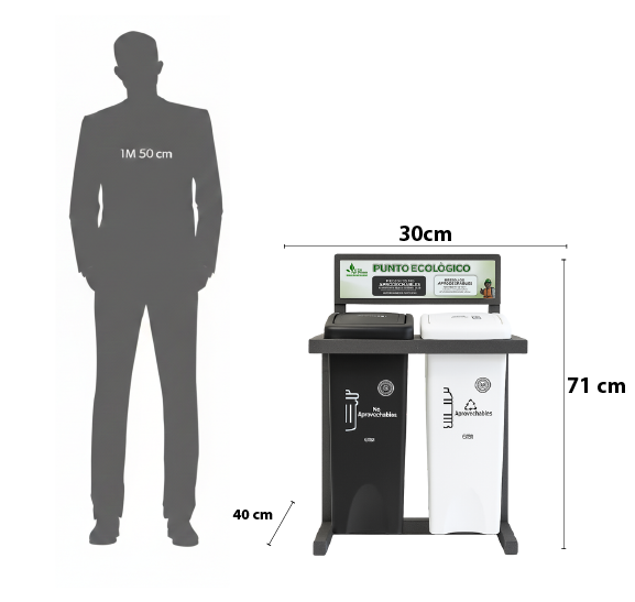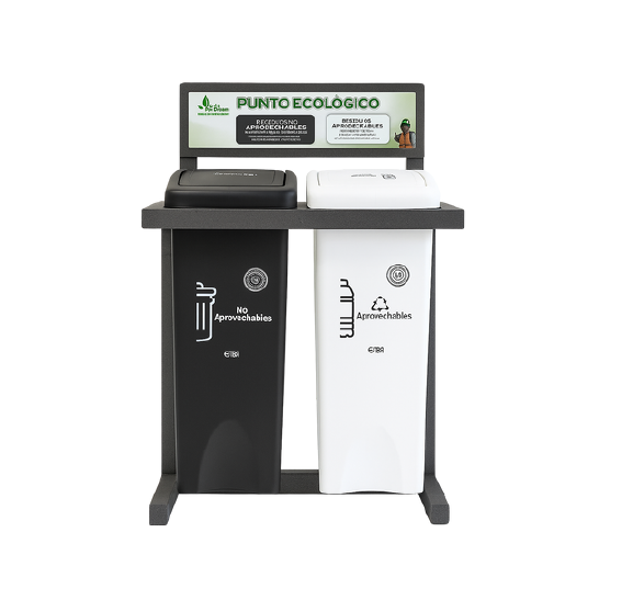 Punto ecológico de 2 puestos con estructura metálica, papeleras tipo vaivén de 55 litros debidamente marcadas y tablero personalizado. Diseñado para facilitar la correcta separación de residuos, es un artículo de alta calidad que cumple con la normativa.