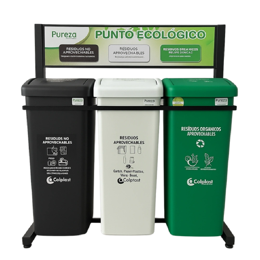 Punto ecológico de 3 puestos con estructura metálica, papeleras tipo vaivén de 55 litros debidamente marcadas y tablero personalizado. Diseñado para facilitar la correcta separación de residuos, es un artículo de alta calidad que cumple con la normativa.